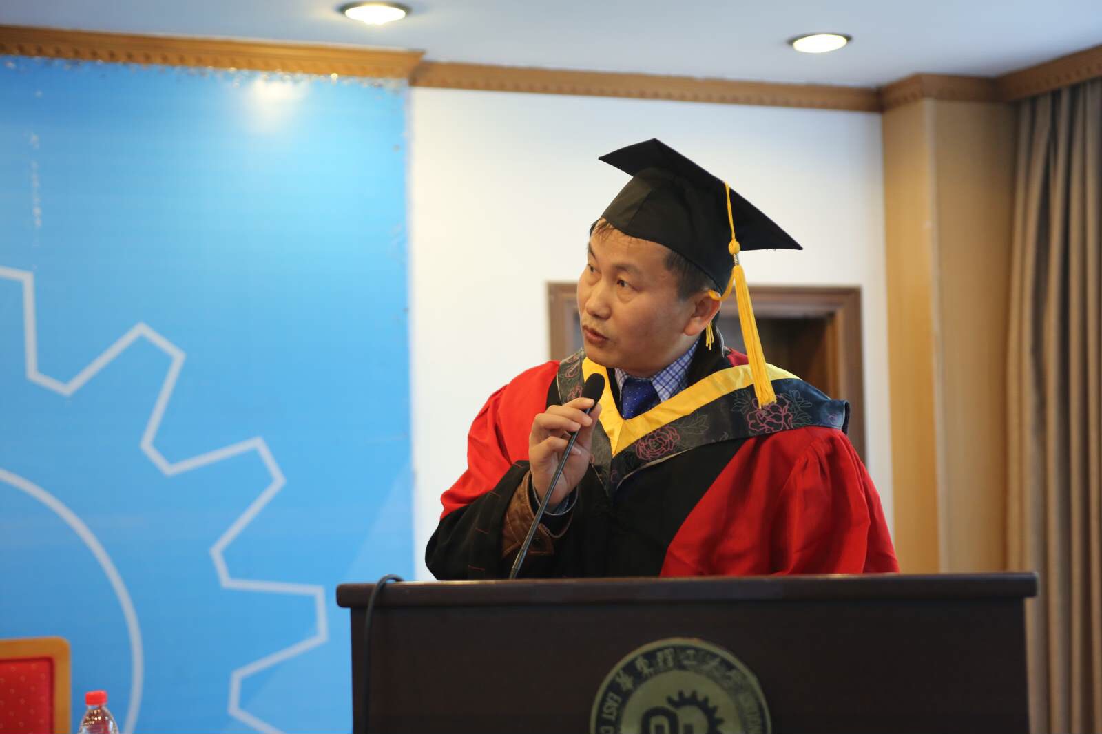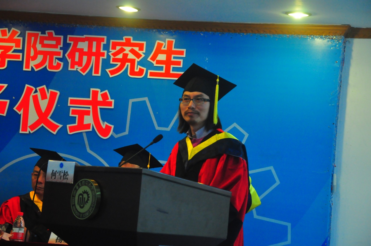 教师代表徐选国博士作为教师代表发言。他指出,在大变革时代,每个个体都面临着各种风险的挑战。他希望全体毕业生:一方面要改变作为一个个体而存在,学会生活;一方面要重构人与人之间的关系,学会合作。