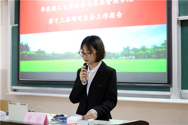 伴随着嘹亮的国歌声,换届选举大会正式开始。第十三届研会主席曾怡向与会领导与代表作了主题为“不忘初心,方得始终”的2017-2018年度工作总结报告。曾怡回顾了这一年研会在学术工作、娱乐休闲活动和委员提案等三个方面中所取得的成绩,并预祝本次换届选举大会圆满成功。工作总结报告获得了全体与会代表的举手通过。