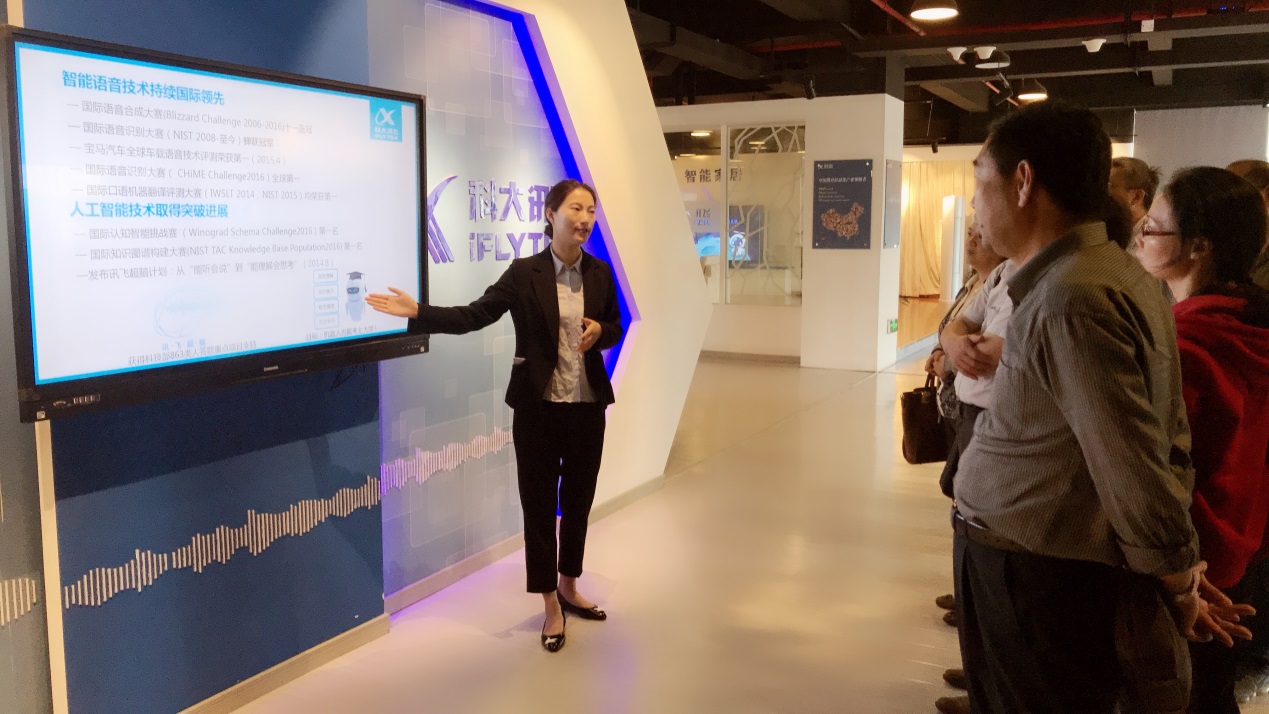 22日上午,学院教师代表来到位于浦东临港的上海科大讯飞公司参观考察,近距离感受人工智能产品的风采。工作人员首先向我们展示了智能语音及语言技术在社交、教育、家居及车载系统中的应用。其代表产品“讯飞输入法”的语音识别准确率与速度已经处于国际领先地位,其方言识别功能让它成为了当前“最接地气”的输入法;而全球首个中文智能语音助手----灵犀,除了可以轻松完成打电话、发短信、设提醒、中英文翻译等功能,还可以识别各种形式的询问语句,并执行正确操作,是一个聪明睿智的人工智能助理;对于教育行业,科大讯飞开发出了一套完整的教育教学系统,大幅减少了教师的工作量,将先进的智能语音与人工智能核心技术应用于教育领域的融合创新,现在已形成了涵盖教学考评管完整环节的智慧教育产品体系;同时讯飞还设计出一系列智能家居产品,实现了通过语音控制实现电视转台、窗帘开关等功能;其语音助手还可以应用于车载系统,在嘈杂环境下保证语音识别准确率不受影响。