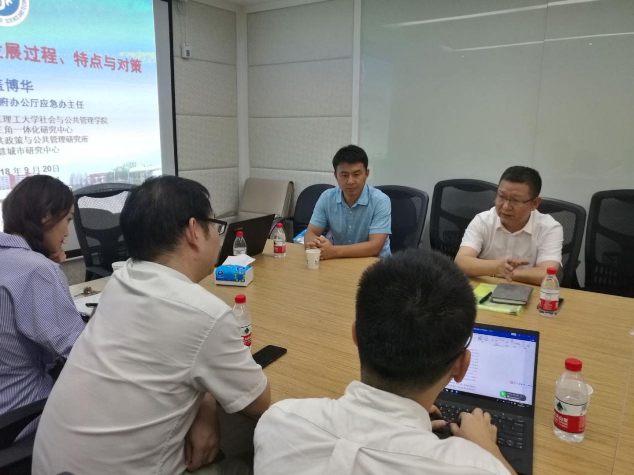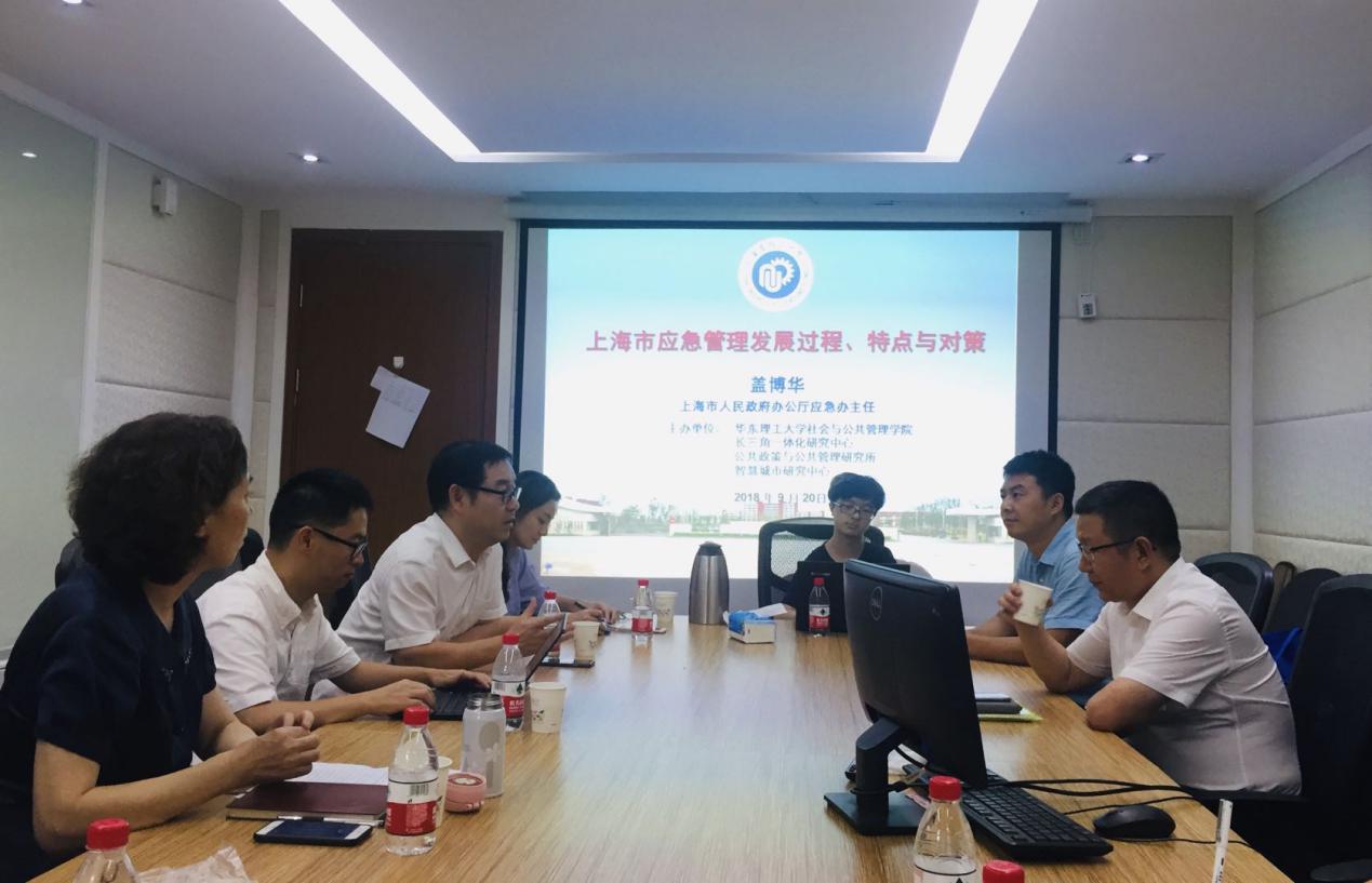 2018年9月20日下午,pg游戏官网长三角一体化研究中心、公共政策与公共管理研究所以及信息学院智慧城市研究中心联合举办的长三角一体化系列高层论坛第七讲在pg游戏电子模拟器318会议室顺利举行。本次论坛邀请了上海市人民政府办公厅应急办主任盖博华做题为“上海市应急管理主要经验与对策”的主题报告。pg游戏官网长三角一体化研究中心主任纪晓岚教授、人文社科处副处长唐有财教授、公共政策与公共管理研究所所长罗建平教授,信息科学与工程学院智慧城市研究中心主任赵文瑜教授,长三角一体化研究中心团队全体成员及博士、研究生参加了会议,会议由纪晓岚教授主持。