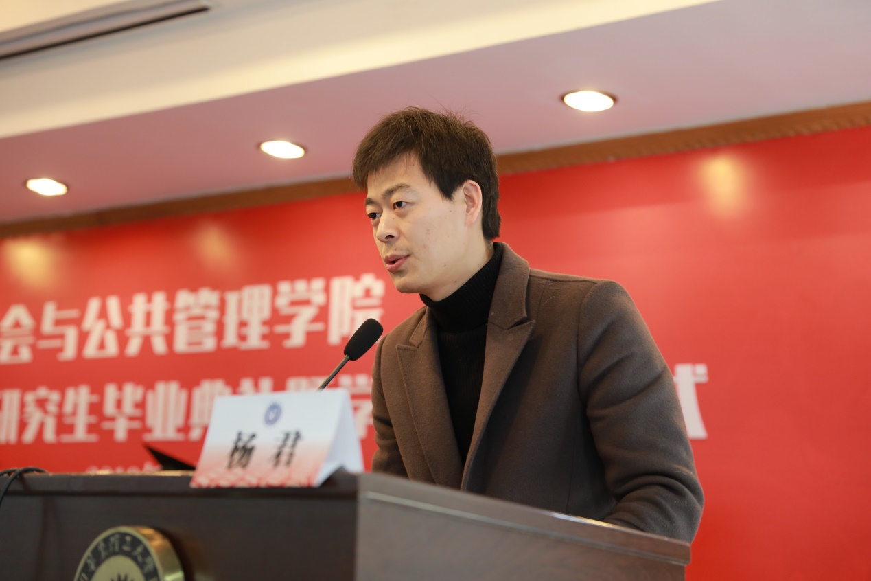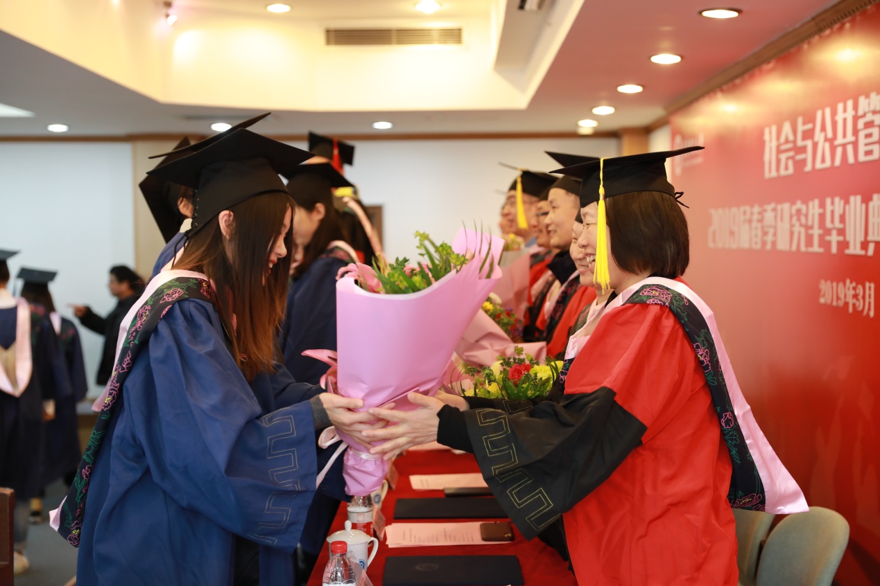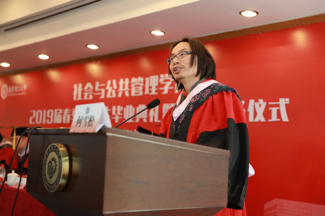 3月8日下午,社会学院2019届春季研究生毕业典礼暨学位授予仪式在逸夫楼演讲厅举行。研究生院常务副院长龚学庆,社会学院院长、党委副书记、社会与法分学位评定委员会主席何雪松,社会学院党委书记张广利,社会学院副院长杨发祥、刘晓亮,公共管理一级学科硕士点导师组组长郭圣莉,土地资源管理导师组组长俞慰刚,MSW教育中心主任费梅苹。系主任、学院部分教师、毕业生家属以及2019届春季毕业研究生共同见证这一庄严而神圣的时刻。毕业典礼由社会学院党委副书记万胤婕主持。