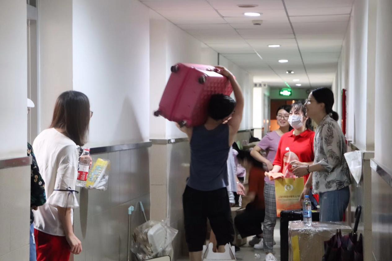 社工162的上海学生蒋屹浏,早早地已经将行李搬运回家,搬迁当天主动返回学校帮助其他同学搬迁宿舍,体现了同学间的深情厚谊。