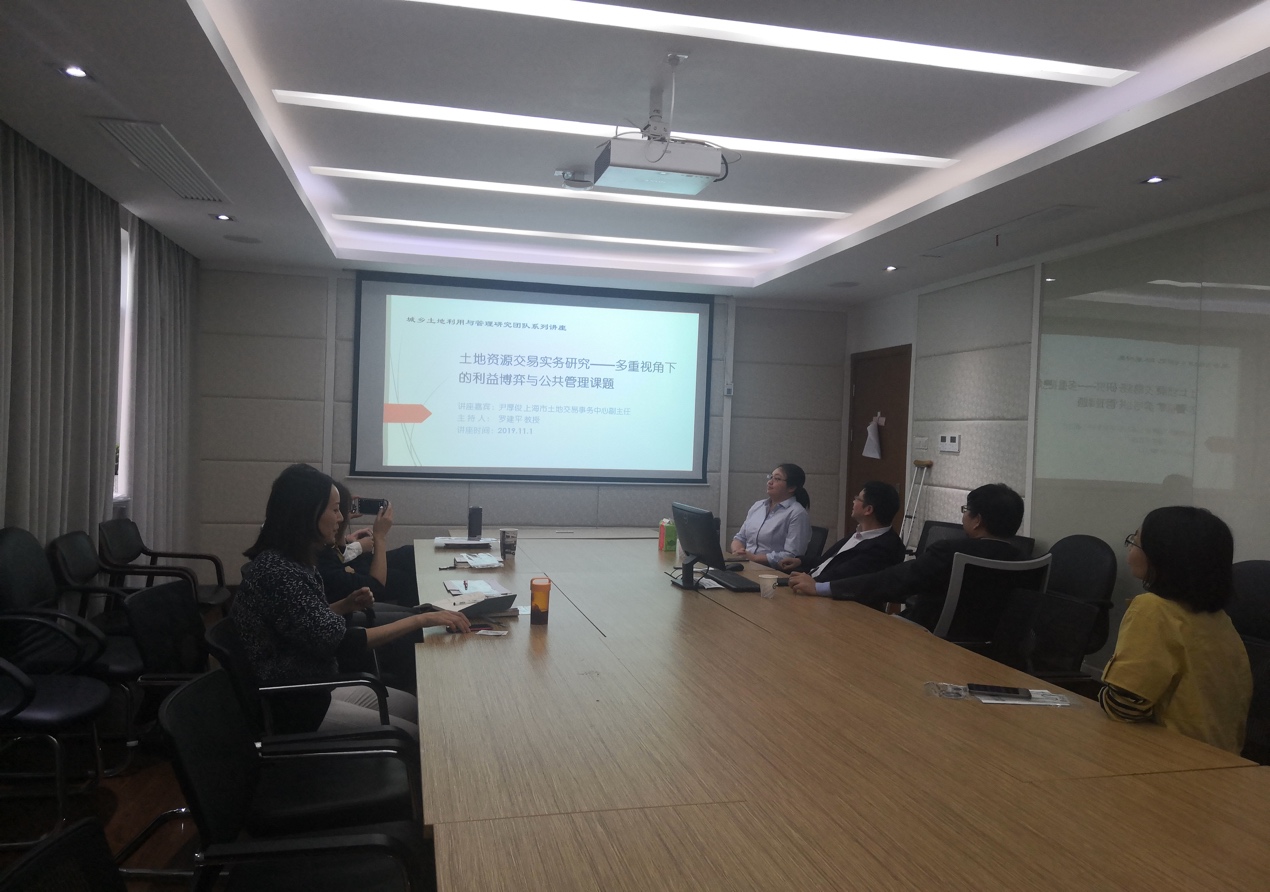 2019年11月1日星期五下午1点30分,pg游戏电子模拟器公共政策研究所、城乡土地利用与管理研究团队联合邀请了上海市土地交易事务中心副主任、全拍卖师协会副会长尹厚俊主任,做了题为《土地资源交易实务研究——多重视角下的利益博弈》的讲座,由罗建平教授主持,讲座在学院324会议室举行。
