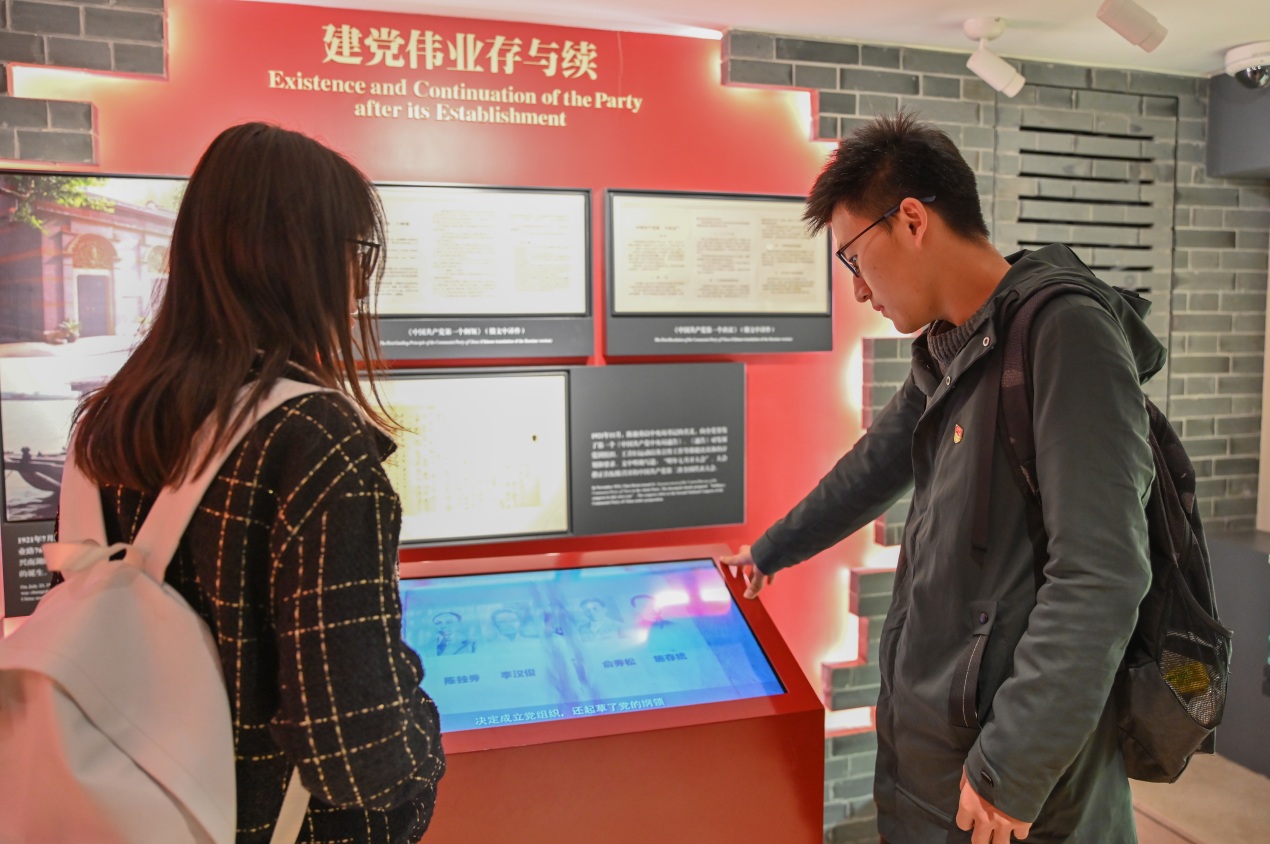 走进序厅,“中国共产党万岁”的字幕和一尊群像雕塑映入眼帘,多媒体展厅开始播放有关中共二大的记录影片,厚重的历史扑面而来,党员和发展对象们纷纷驻足观看,隔着时空触摸感受那段峥嵘的岁月。