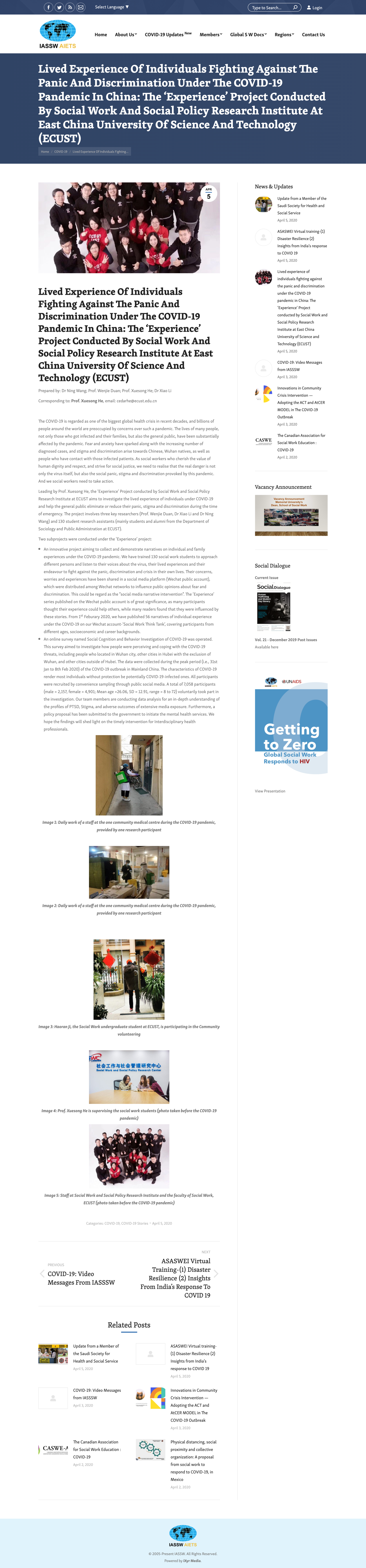 近日,作为联合国咨询机构之一的国际社会工作学院联盟“The International Association Of Schools Of Social Work”(简称IASSW)在新闻网站上报道了由pg游戏电子模拟器何雪松教授领导的干预计划和科研项目。此次新冠“感受”计划和“社会认知”调查项目由pg游戏电子模拟器社会工作及社会政策研究院负责施行,团队成员有段文杰教授、李筱博士、王宁博士以及130名学生研究助理(主要为pg游戏电子模拟器的学生和校友)。项目通过调研一线抗疫人员和普通大众在疫情期间的经历和想法,帮助减少公众对康复患者以及接触者的歧视,促进公众形成正确的抗疫观。