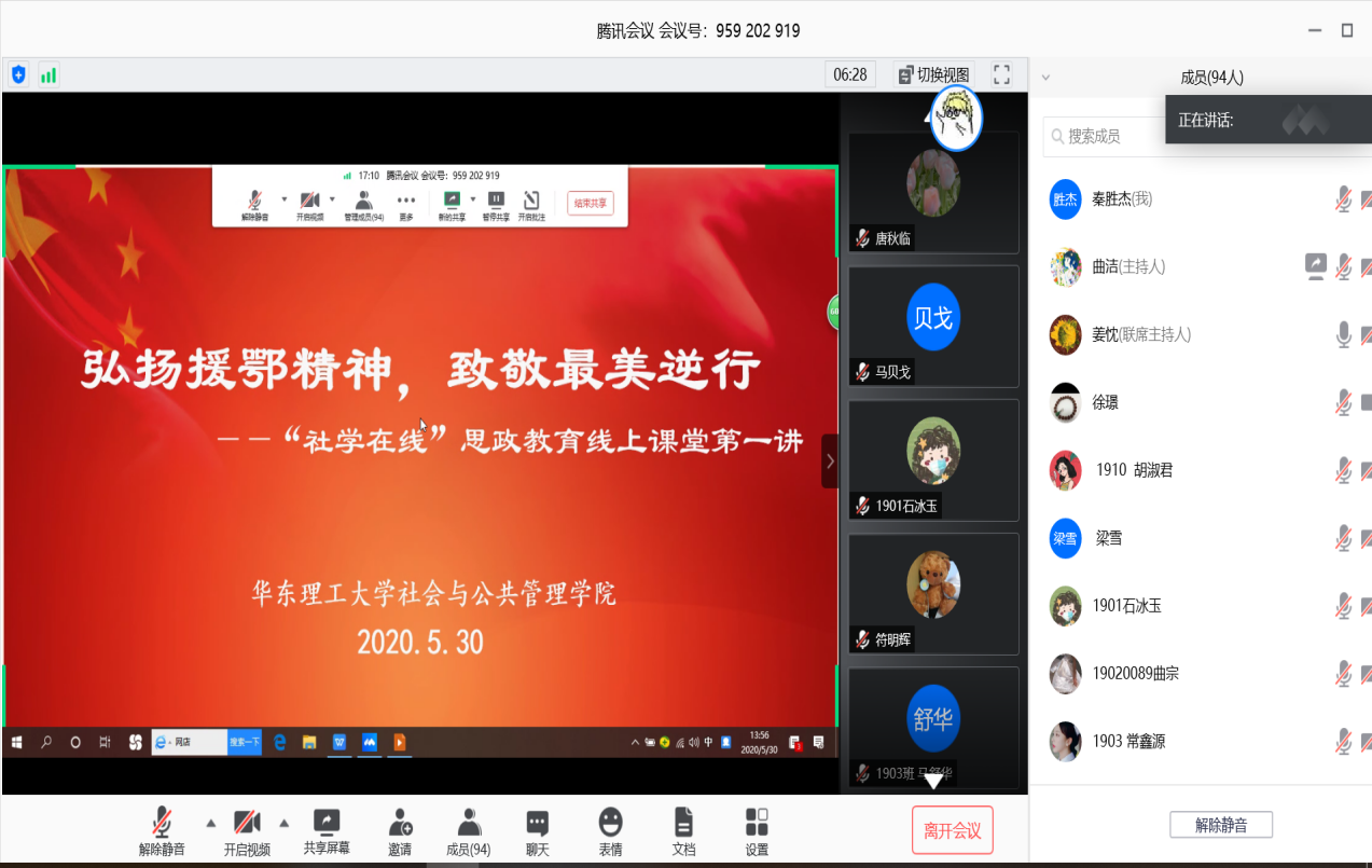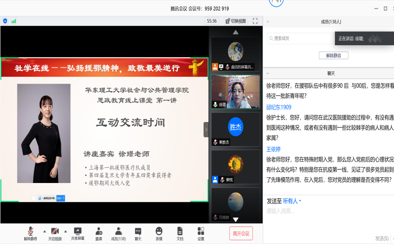 除此之外,为鼓励入党积极分子认真学习抗疫英雄事迹,引领入党积极分子读懂中国战“疫”这本无字之书,5月30日下午,社会学院入党积极分子培训班开展“弘扬援鄂精神,致敬最美逆行”线上课程。活动邀请上海第一批援鄂医疗队成员,复旦大学附属中山医院护士长徐璟作为主讲嘉宾分享抗疫故事、交流抗疫感悟。在互动交流时间,大家结合专业关注战疫过程中的心理情况,学习实践中的管理知识等积极提问,并送上对抗疫一线医护者最崇高的敬意,徐璟也结合自身医务人员经历和抗疫感悟对同学们的提问进行了细致真诚的回答,并在最后向在场所有入党积极分子寄语。