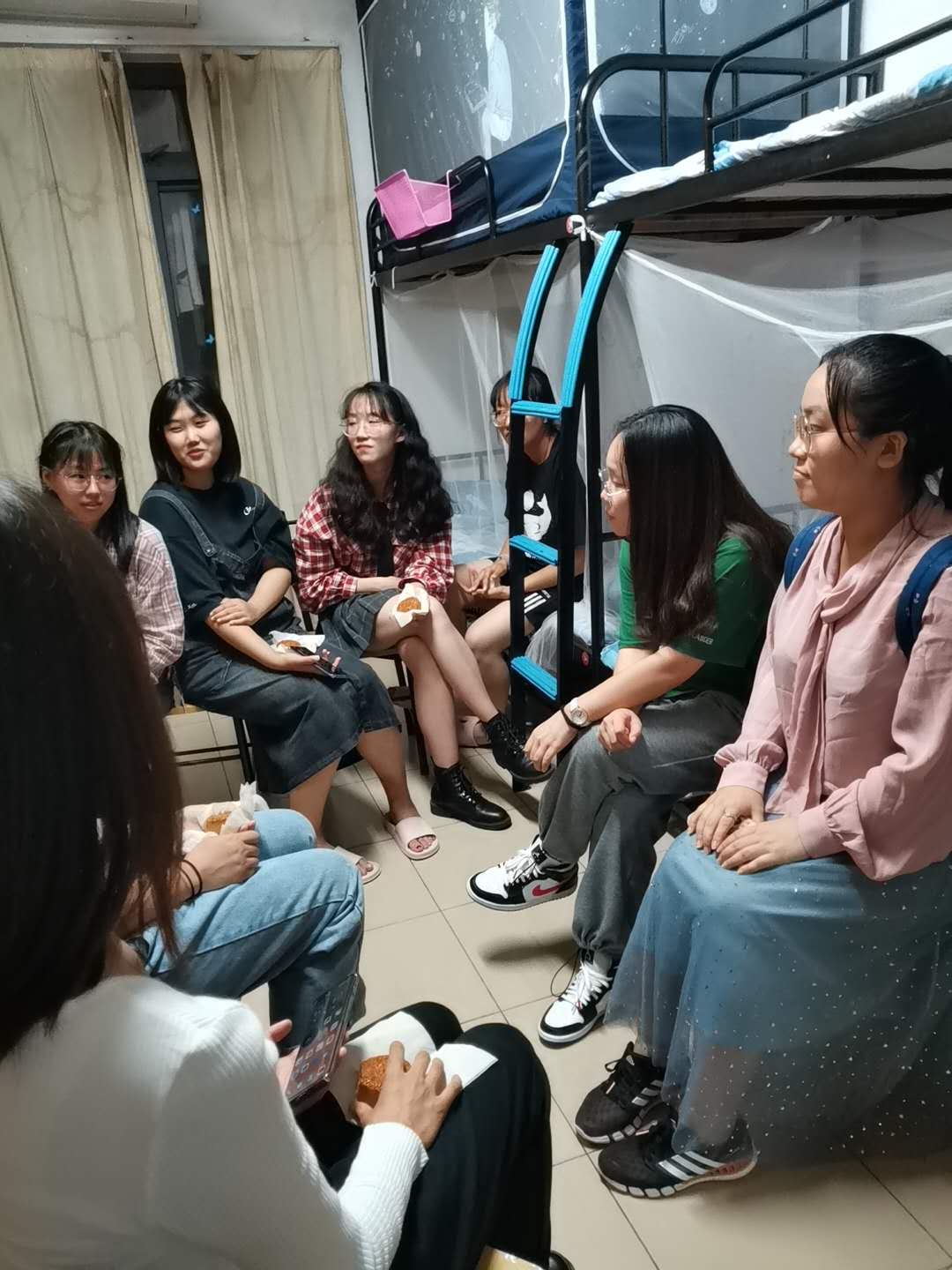 在女生寝室,张雅琪向新生解答了关于学生工作的有关问题提出,学生工作的本质是为学生服务,处理学生生活、学习等相关问题的服务型工作,并结合自身一年的学生工作经历提出学生工作的意义所在。同时张雅琪对于双节假期期间的生活方面提出了建议,女生尽量不要一个人单独出校,出门牢记戴口罩,坚持每日健康汇报等安全注意事项。
