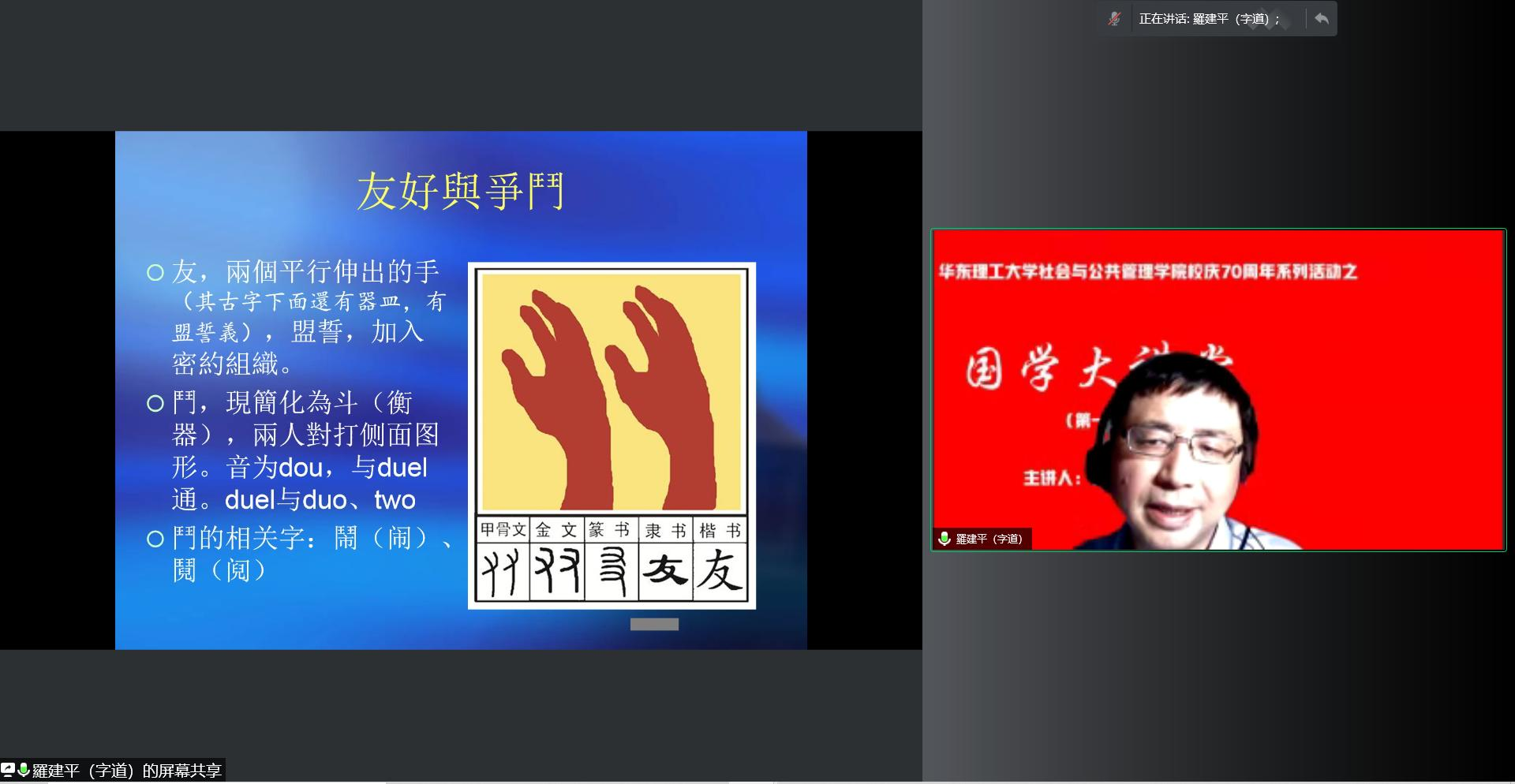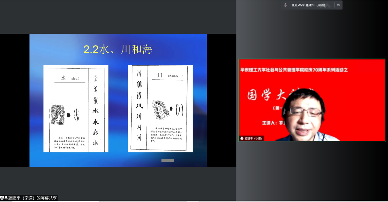 3月16日,为迎接pg游戏电子模拟器校庆70周年、充实学生在疫情防控期间的学习生活,鼓励师生们用大师的睿智体验国学的魅力,用人文的情怀感受文化的风采,pg游戏电子模拟器推出了迎接校庆70周年系列活动之“国学大讲堂”文化讲座。首场讲座由社会学院硕士生导师、公共管理与公共政策研究所所长罗建平教授主讲,他以“汉字中的人文智慧”为题,向参与的讲座的师生们分享了近三十年对于汉字的研究心得。