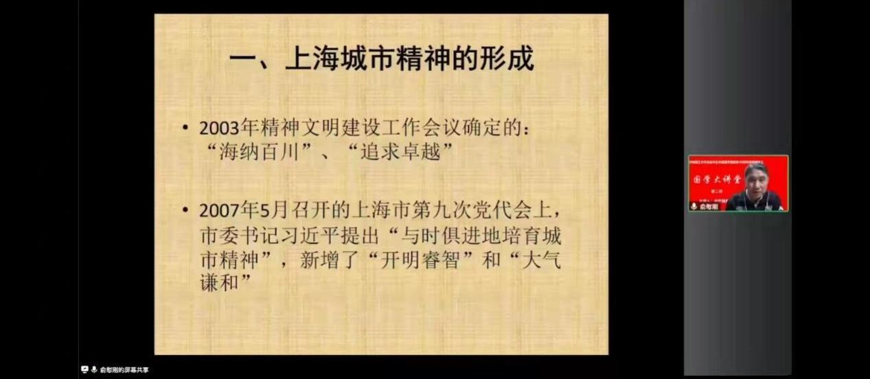 我们现在所在的上海是卓越的全球城市,是一个令人向往的未来之城、人文之城、生态之城。俞教授在讲座最后鼓励同学们要坚持“四史”学习,通过学习历史,了解文化形成的脉络,坚定文化自信,提高自身文化底蕴与文化修为,在上海面向世界的过程中发挥青年人的贡献,讲好中国故事。
