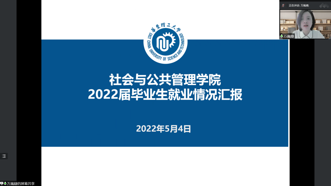 首先,万胤婕老师汇报了学院目前本研毕业生就业的基本情况和特点。对于目前学院就业工作中所遇到的难点,万胤婕表示学院领导高度重视毕业生的就业情况,将就业工作列为上半年度重点工作之一。毕业班辅导员在前期精准排摸学生情况的基础上,每周都会动态调整未就业台账,及时更新毕业生就业进展,了解未就业学生的具体个人情况,根据学生个人意向定向推荐岗位。