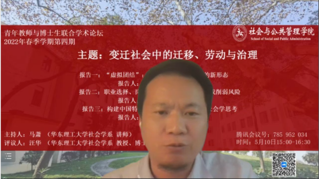 5月10日,pg游戏电子模拟器第四期青年教师与博士生联合论坛在线上举行,主题为“变迁社会中的迁移、劳动与治理”。何雪松院长、陈丰副院长、汪华教授以及100余名师生参加论坛,论坛由马萧老师主持。