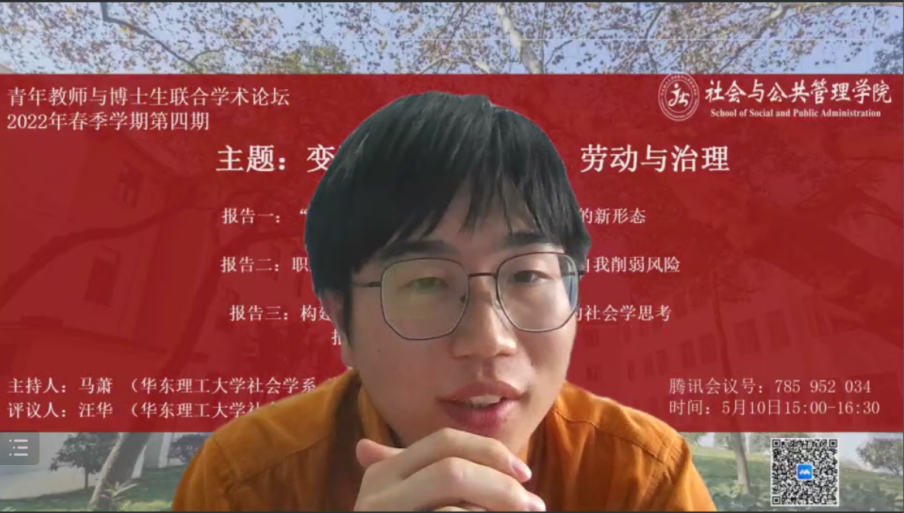 本次论坛主要由三位师生进行交流分享。社会学2020级博士生沈锦浩分享了“‘虚拟团结’:互联网时代劳工团结的新形态”为题的研究,通过对互联网行业女性从业者和卡车司机两个劳工群体的调研,探讨了“虚拟团结”作为互联网时代劳工团结新形态的可能性。