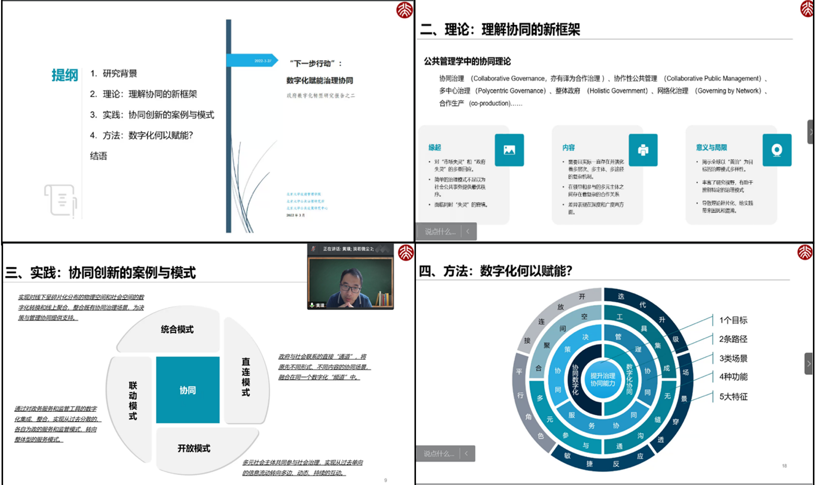 黄璜教授首先从宏观背景阐述了数字政府的重要性,具体阐述了数字政府建设的四个方面:工具的数字化“连接”、业务的数字化“赋能”、主体的数字化“协同”、组织的数字化“重构”,并且强调“打造高效协同的数字政府”成为当下中国数字政府建设重点和亮点。随后,黄璜教授从理论层面提出了协同新框架,对公共管理学和系统科学中的协同理论分别进行了讲解,特别介绍了“赛伯格(Cyborg)式”的治理模式,其代表数字化以不同方式和程度“嵌入”各类协同场景。接着,黄璜教授将理论与实践结合,围绕协同创新的案例与模式分享了实践应用场景,介绍了数字化赋能协同实践的四种基本模式:统合模式、开放模式、直连模式、联动模式。最后,黄璜教授从“一个目标”、“两条路径”、“三类场景”、“四种功能”和“五个特征”五个方面具体展现了数字化何以赋能的方法,并对此次讲座主题进行总结:数字政府归根到底是治理现代化的刻面之一,其不是一成不变的事业,是应用数字化不断迭代,解决实际问题的过程。黄璜教授的分享既有前沿的理论阐述又有详细的案例分析,给我们带来了新的启发与思考。