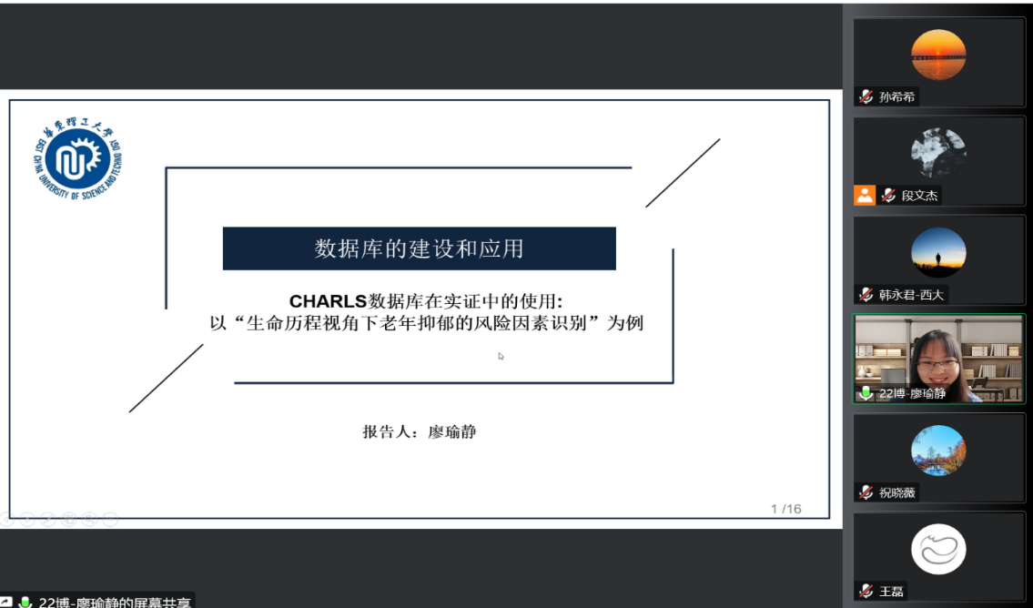 2022级博士生廖瑜静汇报的题目是“CHARLS数据库在实证中的使用—以“生命历程视角下老年抑郁的风险因素识别”为例”。首先介绍了CHARLS数据库的特点和本研究选用此数据库的原因,然后结合“生命历程视角下老年抑郁的风险因素识别”论文,详细介绍了对此数据库的使用。从当前的老龄化和老年抑郁流行率的背景引出研究主题,基于文献回顾,提出研究框架,呈现数据检验模型以回应当前研究存在的局限,更系统地识别老年抑郁的风险因素。随后报告了数据整合的方法,通过合并数据库中2011至18年数据以及合并社区、家户和个人层面的数据,以整合成面板数据作为模型检验的证据,最后呈现了研究结果和针对研究发现的社会工作服务讨论。