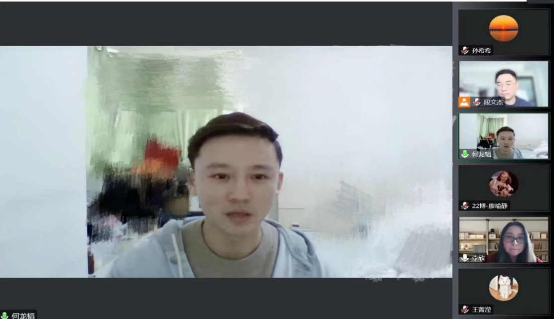 何龙韬老师对三位汇报人的汇报内容进行了深入精彩的点评,对三位汇报人的汇报内容给予了高度的赞赏和肯定,同时,指出了可供研究提升的空间和需要注意的问题。对博士生廖瑜静点评:1、整篇文章的分析框架很完整,对生命历程理论概念的解读和应用比较全面;2、可以在政策建议上更加深入;3、可以利用混合研究设计进行完善。对博士生孙希希的点评:1、建议在BJSW期刊上投稿;2、研究结果和研究建议需要更加聚焦和精进,需要解释清楚研究中循证社会工作研究与实务的相关性逻辑;3、建议增加定性研究做三角互证。对博士生王菁滢的点评:1、研究的分析材料十分有意义;2、对于失控感概念的需要明晰化;3、失控感量表较之既往压力和控制感量表的创新之处需要进一步探索和讨论。