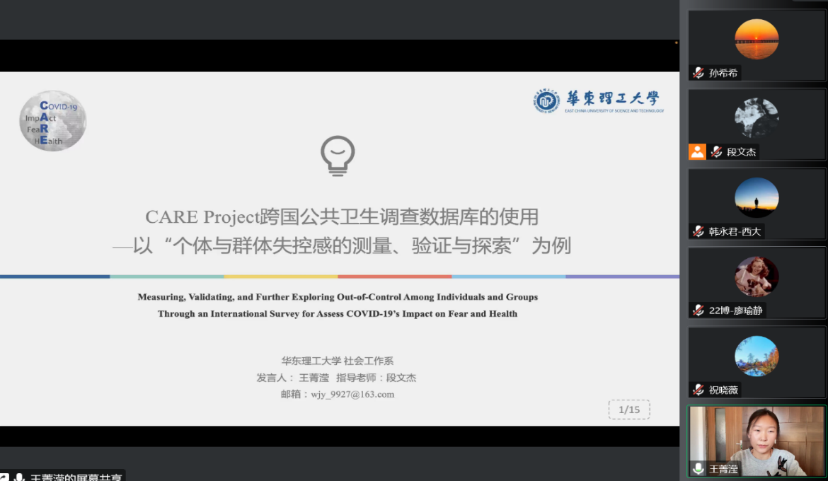 2021级博士生王菁滢汇报的题目是“CARE Project跨国公共卫生调查数据库的使用—以“个体与群体失控感的测量、验证与探索”为例”。首先,报告指出在全球重大公共卫生危机的情境下个体所面临的压力问题,并基于Lazarus的经典压力模型提出了作为情境压力的失控感概念。而后,通过文献回顾提出本研究的主要目的,即采取跨国家和地区样本,在全球重大公共危机情境中,通过两个研究阶段,实现开发、验证失控感量表。随后,报告中介绍了CARE数据库的具体情况、该研究中使用的测量工具和数据分析测量的概况,并呈现了研究结果,即证明了失控感量表的测量在多个国家地区具有较好的心理测量学特征。最后提出了研究局限性及未来展望。