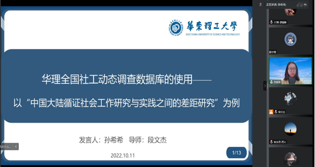 2022级博士生孙希希报告的题目是“华理全国社工动态调查数据库的使用—以“中国大陆循证社会工作研究与实践之间的差距研究”为例”。报告首先介绍了循证社会工作在发展过程中出现了社会工作研究人员和从业人员的目标和需求之间出现了脱节现象,因此希望通过使用混合研究方法探讨中国大陆循证社会工作研究与实践之间的差距以及如何进一步提高循证实践在社会工作研究和实务中的应用。报告重点介绍了为什么在混合研究中的定量研究中使用了中国社会工作动态调查数据库,介绍了该数据库的优点以及如何在研究中使用了该数据库。随后,报告中呈现了研究结果,即对中国大陆社工从业者循证实践态度的影响因素以及不同特征群体间的差异。最后提出了未来展望并倡导社工学界可以多尝试使用中国社会工作动态调查数据库。