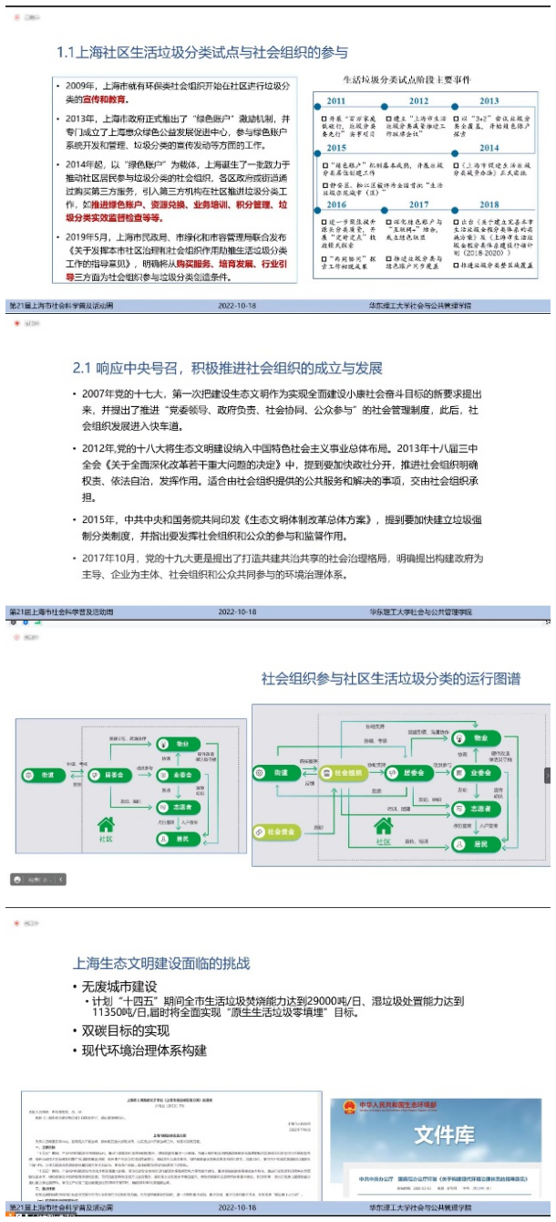 2022年10月18日,第21届上海市社会科学普及活动周系列讲座第一讲在线上顺利举行。pg游戏电子模拟器副教授石超艺老师作为主讲嘉宾为师生做了题为“协同治理视域下社区生活垃圾分类的政社合作‘上海模式’试析”的科普讲座。本次讲座由pg游戏电子模拟器主办、pg游戏电子模拟器承办,由pg游戏电子模拟器行政管理系主任牛星副教授主持。