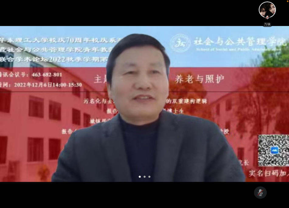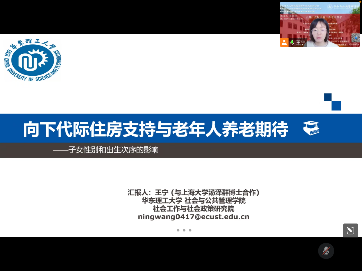 王宁老师就“向下代际住房支持与老年人养老期待——子女性别与出生次序影响”这一话题进行了报告。报告以我国城乡父母对子女进行买房支持这一普遍现象为研究背景,探索存在向下住房支持的多子女家庭中父母对子女的住房支持与其未来照料和经济支持期待之间的影响机制,以及该机制下子女性别和子女出生次序的影响。接着,王宁老师从孝文化主导下的传统照料期待、利他主义、基于公平的互惠、子女性别与出生次序四方面进行了文化综述,介绍了研究的数据、变量以及研究方法并呈现了部分研究结果,而后王宁老师从研究特色、主要发现、研究局限和政策启示四方面对该研究进行了总结,并讨论了研究的政策意涵,同时也指出本研究存在的局限性及未来的研究方向。