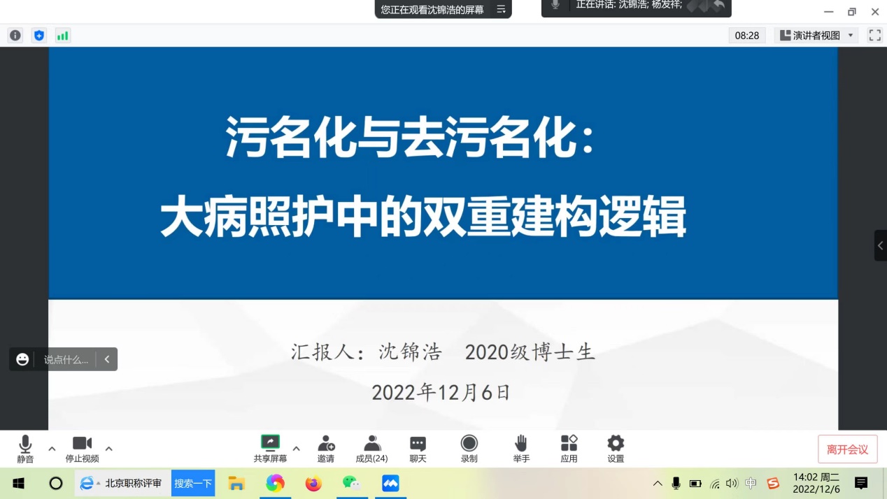 2020级博士生沈锦浩汇报的题目是“污名化与去污名化:大病照护中的双重建构逻辑”。沈锦浩博士所汇报的课题深刻剖析了大病照护中的污名的深层象征意涵和形成逻辑,阐述了护工在照护实践中的自我形象重塑和自我认同重构。着重分析了大病照护中的工作类型污名,社会地位污名,个人素养污名和性别刻板印象这四重标签;从照护工作中的良善立意、现代家庭的孝道重构、社会分工的专业价值以及国家建设的现代支撑分析去污名化的意义建构。最后提出需要重视自我意义建构背后的巨大社会价值等讨论。
