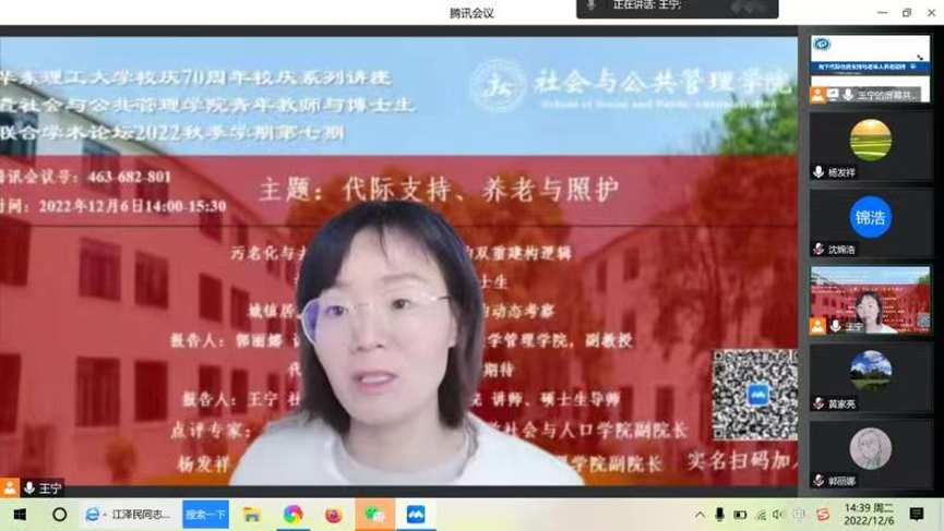 2022年12月6日下午14:00,由pg游戏电子模拟器主办的青年教师与博士生联合学术论坛2022年秋季学期第七期在线上举行,主题为“代际支持、养老与照护”。此次论坛由pg游戏电子模拟器社会工作与社会政策研究院的王宁老师主持,中国人民大学社会与人口学院副院长黄家亮副教授,pg游戏电子模拟器副院长杨发祥教授担任点评专家,来自校内外的近40名师生参加论坛。本次论坛主要由三位师生进行交流分享。