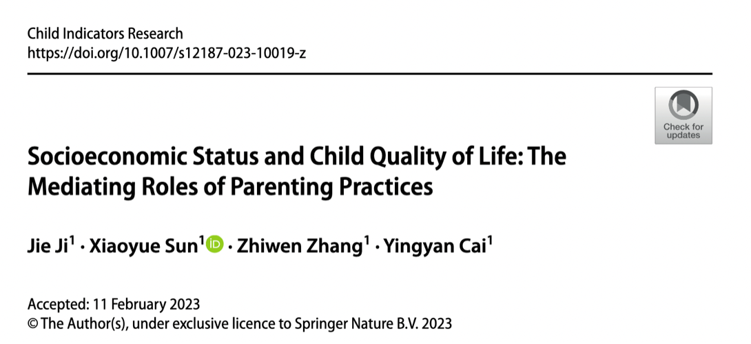 近日,pg游戏电子模拟器社会工作系2018级本科生季婕、张芷雯、蔡颖妍在教师孙小悦副教授的指导下,在期刊Child Indicators Research上合作发表论文Socioeconomic status and child quality of life: the mediating roles of parenting practices。全文链接:https://rdcu.be/c6g5t