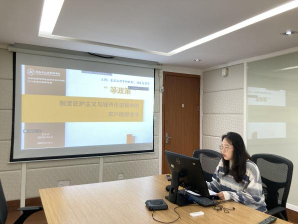 博士生蓝怡琪汇报的题目为《“等政策”:制度庇护主义与城市化进程中的农户建房选择》。报告首先梳理了在上海市建房政策紧缩的背景下,上海市农民建房“等政策”的话语表达和行为选择。接着论文基于国家与农民关系的视角进行了文献梳理,指出当前的研究脉络大多从国家政权建设和动员、农民抗争与反行动的角度对国家与农民关系进行研究,并在此基础上提出了“制度庇护主义—家庭发展机遇”的研究框架。通过“谁在等政策”“‘等政策’的时间叙事”展开现有农民建房“等政策”样态,并指出应当在“国家制度—农民生活”的视角中展开对于农民建房“等政策”的理解。