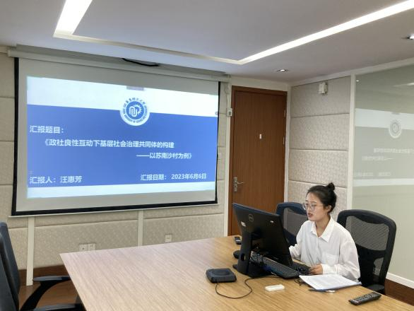 博士生汪惠芳汇报的题目为《政社良性互动下基层社会治理共同体的构建——以苏南沙村为例》。报告首先回顾了现有文献中“社会治理共同体内多元主体互动”及“社会治理共同体的构建路径”。接着,通过对苏南沙村案例的深入分析,指出当前国家、社会以及两者之间的良性互动形态,并发现沙村基层社会治理共同体的形态主要依赖于治理共识的达成、多元主体的参与、公平的利益分配与科技支撑。最后,论文提出以党建引领为中心的政社良性互动共同体,需要从平台搭建、资源整合和动力激活三个方面入手,方能实现基层治理的政社良性互动。