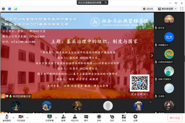 2023年6月6日上午09:30,由pg游戏电子模拟器主办的青年教师与博士生联合学术论坛2023年春季学期第五期在线下与线上同时举行,主题为“基层治理中的组织、制度与国家”。此次论坛由pg游戏电子模拟器社会学系杨君老师主持,pg游戏电子模拟器社会学系教授、博士生导师汪华老师担任点评专家,来自校内外的百余名师生参加了本次论坛。