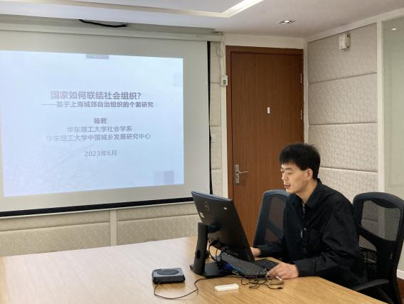 杨君老师汇报的题目为《国家如何联结社会组织——基于上海城郊自治组织的个案研究》。报告首先回顾了“自治组织何以成为一个研究问题”,指出上海城郊自治组织研究的现实基础和理论意义。接着,从国家、多层级政府与社会组织的多元联结方式展开分析。报告指出,自治组织经历了从社群生活到国家组织化的过程,在这一过程中,一方面,自治组织内部具有很强的团结性,另一方面,自治组织与国家的对接又表现为一种“弱组织性”,这种国家与社会的联结进一步拓展了既有国家与社会二元论,丰富且推进了学术界关于国家与社会组织的再思考。