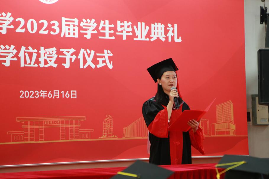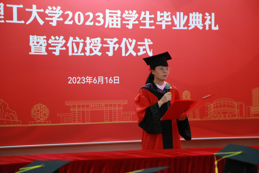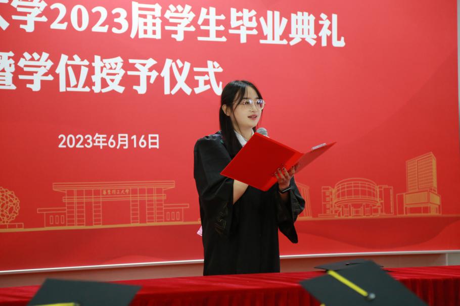 伴随着雄壮的国歌声响起,毕业典礼正式开始。仰望星空,脚踏实地,毕业生们以青春的名义进行《青春有为》毕业宣言。“作为新时代的华理青年,我们生逢其时,重任在肩。我们要坚定不移地听党话、跟党走,胸怀祖国,服务人民。”坚定的誓言从口中说出,大家必将踔厉奋发、砥砺前行,在建设中国式现代化的火热实践中绽放绚丽之花。