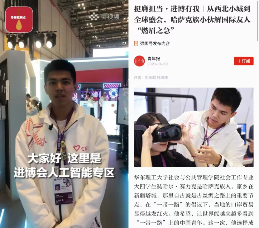 在本次进博会工作中,社会学院志愿者以丰富的志愿经历和高度的热情专注服务,充分起到榜样引领作用,志愿者典型事例被多家媒体报道。其中,2020级本科生奘哈尔·赛力克的事例登上新民晚报、光明网新闻中心、中国青年网等多家媒体新闻。