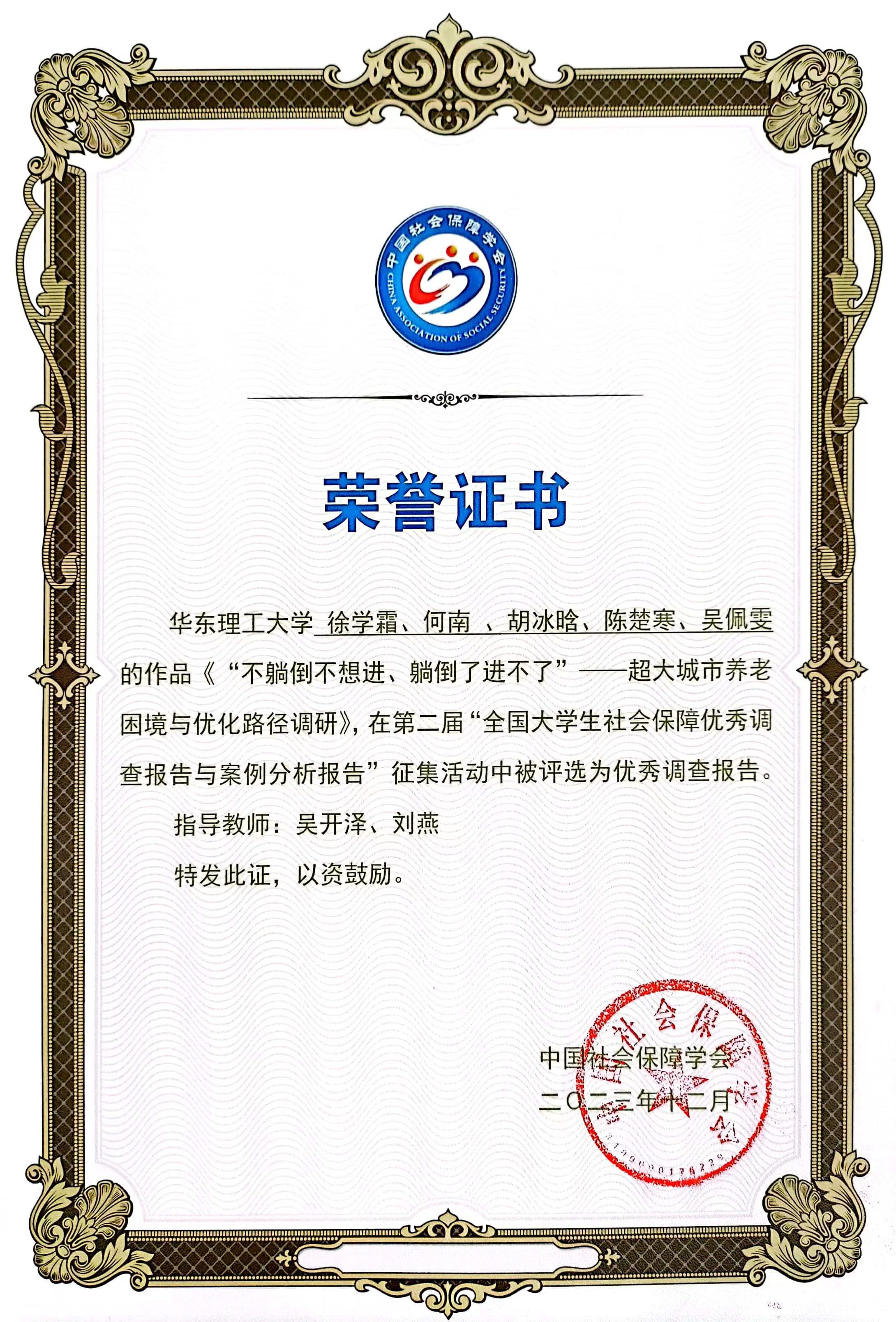 2023年12月9号,由中国社会保障学会主办的第二届“全国大学生社会保障优秀调查报告与案例分析报告”成果分享会在广西师范大学成功举办。pg游戏电子模拟器公共政策系社会保障专业硕士研究生徐学霜、何南、胡冰晗、陈楚寒和吴佩雯在吴开泽副教授和刘燕副教授指导下完成的作品《“不躺倒不想进、躺倒了进不了”——超大城市养老困境与优化路径调研》成功入围,获得优秀调查报告奖,并由陈楚寒同学代表团队进行了成果汇报,该报告得到与会专家的高度评价。pg游戏官网社会保障研究生已经连续两届获得全国大学生社会保障优秀调查报告的荣誉。
