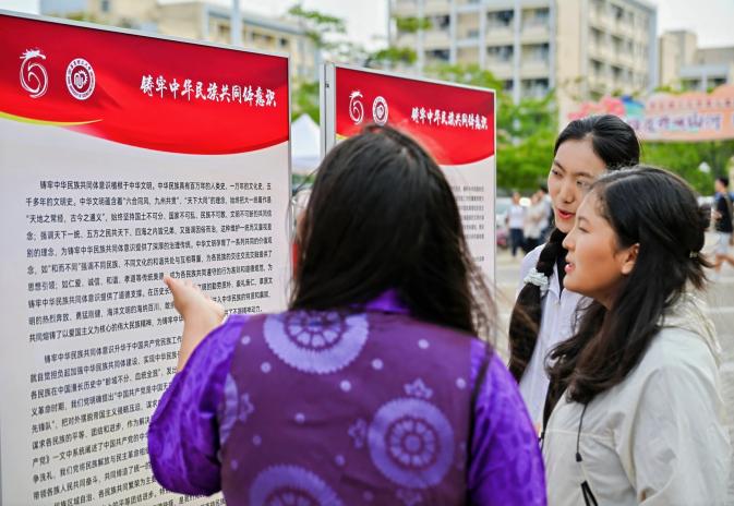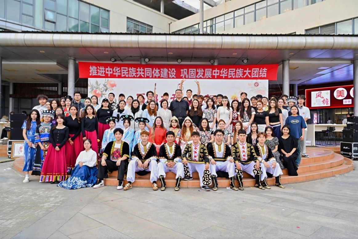 活动现场,风情各异的民族服饰、制作精美的民族工艺品、美味的民族小吃等陈列其上,供参会师生近距离互动,感受民族文化的交融之美;民族知识问答、民族文化体验、民族工艺品手工制作等集章小游戏,让同学们深刻地感受到中华文化兼容并包的独特魅力;维吾尔族的旋转、藏族的踢踏、蒙古族的豪迈甩手……民族特色音乐吸引广大观众共同载歌载舞,在共同的音乐舞蹈中欢声笑语,沉浸在“中华民族一家亲”的热情氛围中。
