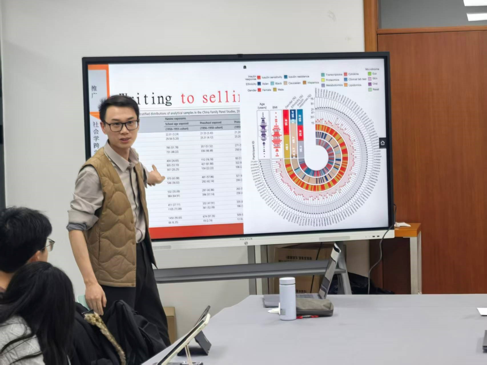 在学术论文写作层面,胡开副教授也为大家拆解了获得跨学科优势的具体实践路径:既要兼具专业性与通用性,以本专业核心思维为根基,同时积极借鉴其他学科分析问题的方法。这就要求同学们既要保持好奇心,探索能否用自然科学方法解决某一社会学问题,也要主动建立“个人壁垒”——比如强化数学、计算机等通用工具的学习,在日常生活中保持多学多看的态度。其中,“合作”的重要性被反复提及。胡开副教授结合自身经历现身说法,鼓励同学们主动开展跨学科交流与合作,以此体现分析方法的创新性。除此之外,他还围绕写作细节展开分享,通过对比相同研究主题的两份论文的数据描述图示,引导同学们认识到数据可视化对于提升研究成果传播力与认可度的显著作用。