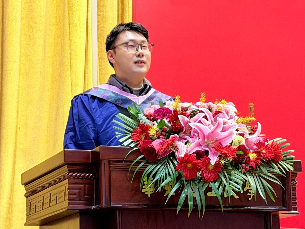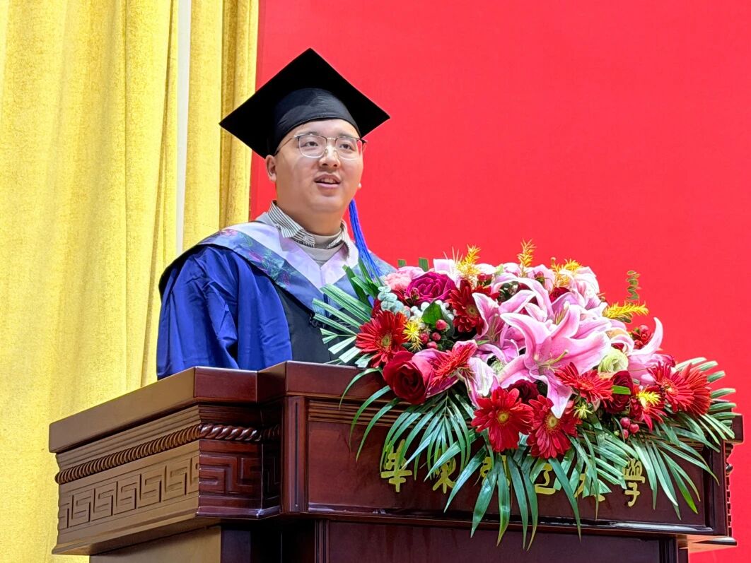 23级社会工作专业硕士生李桥墩首先向母校、恩师及父母致以诚挚谢意。他感慨算法时代的变化与社会科学的价值,分享了“爱你老己”与“修筑人间”两个关键词,希望大家在未来奔波中永远接纳自己、保留一份对自己内心感受的尊重;用专业去修补社会的裂痕,用善意去填平人心的沟壑。他寄语同窗带着松弛感与使命感奔赴新程,在不确定的世界里活成确定的奇迹。